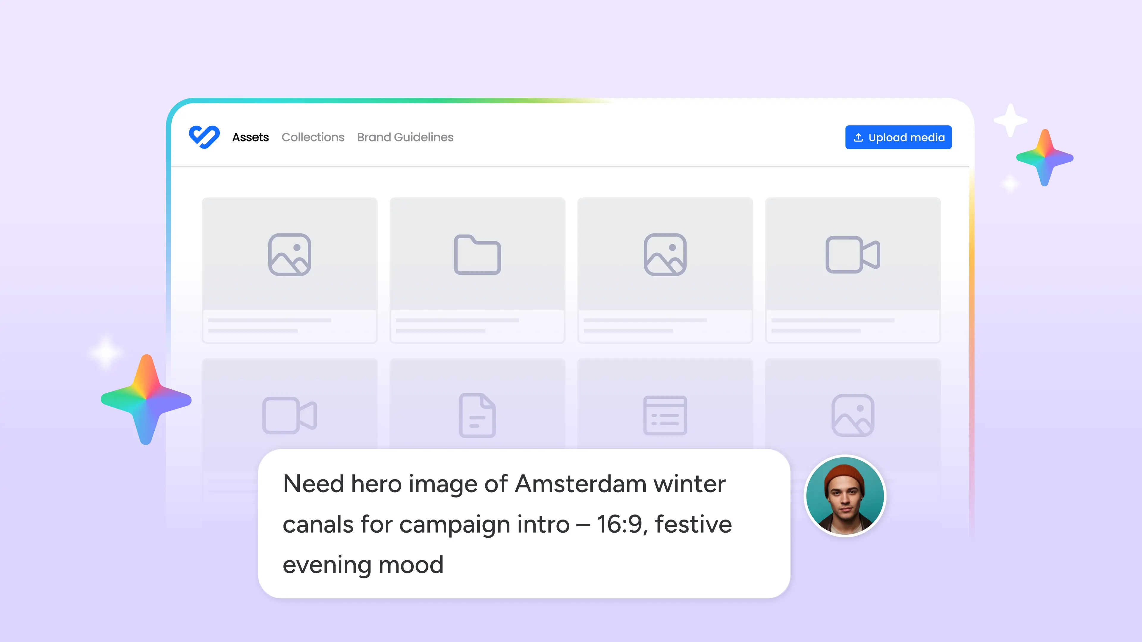 "Need hero image of Amsterdam winter canals fro campaign intro..." → AI visual search finds 8 matching images, curates results, delivers with usage rights: "Here are curated assets—need anything else?"