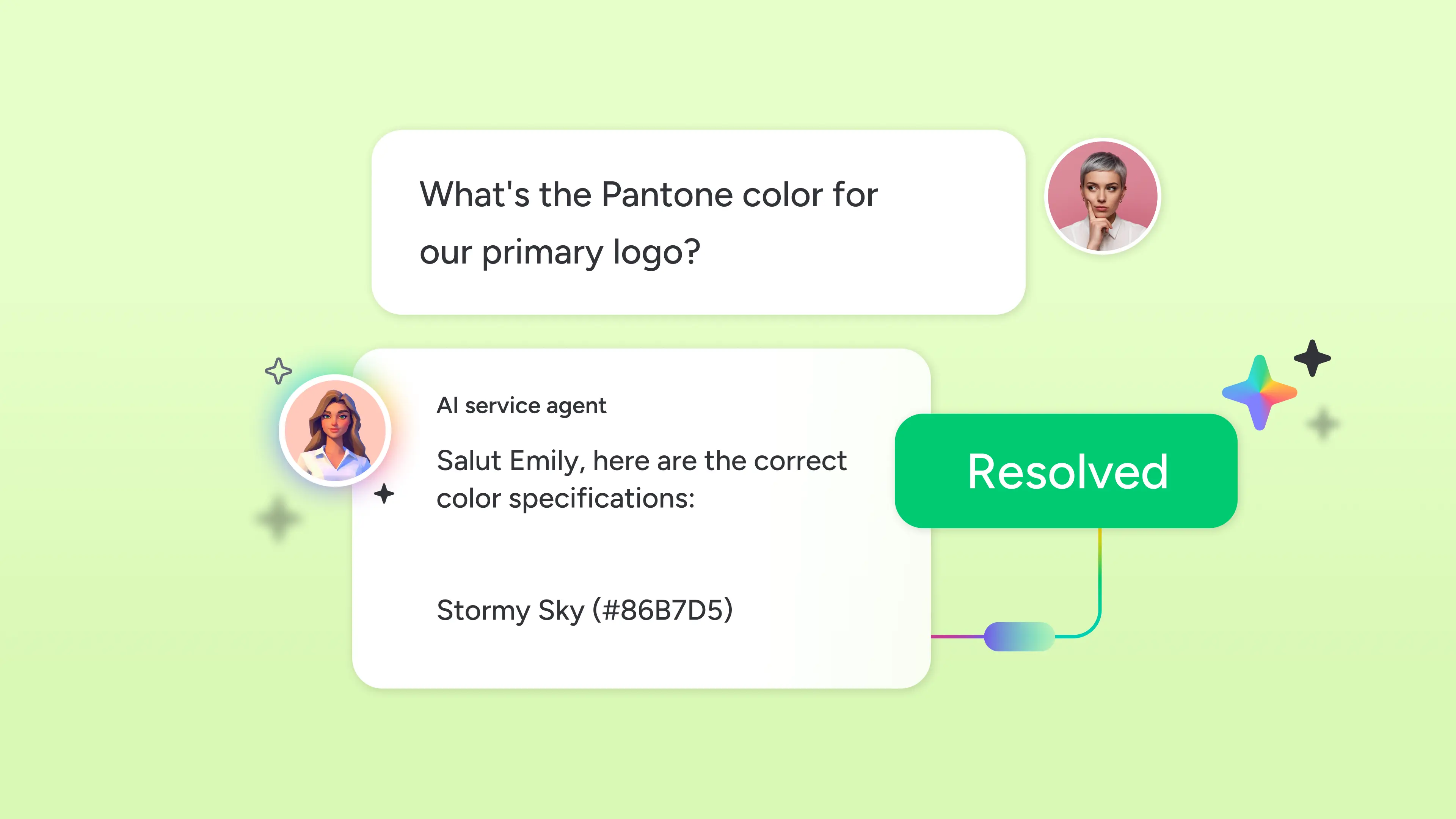 "What's the Pantone color for our primary logo?" → Instant automated response: "Logo primary color is Pantone 2685 C" with usage guidelines attached.