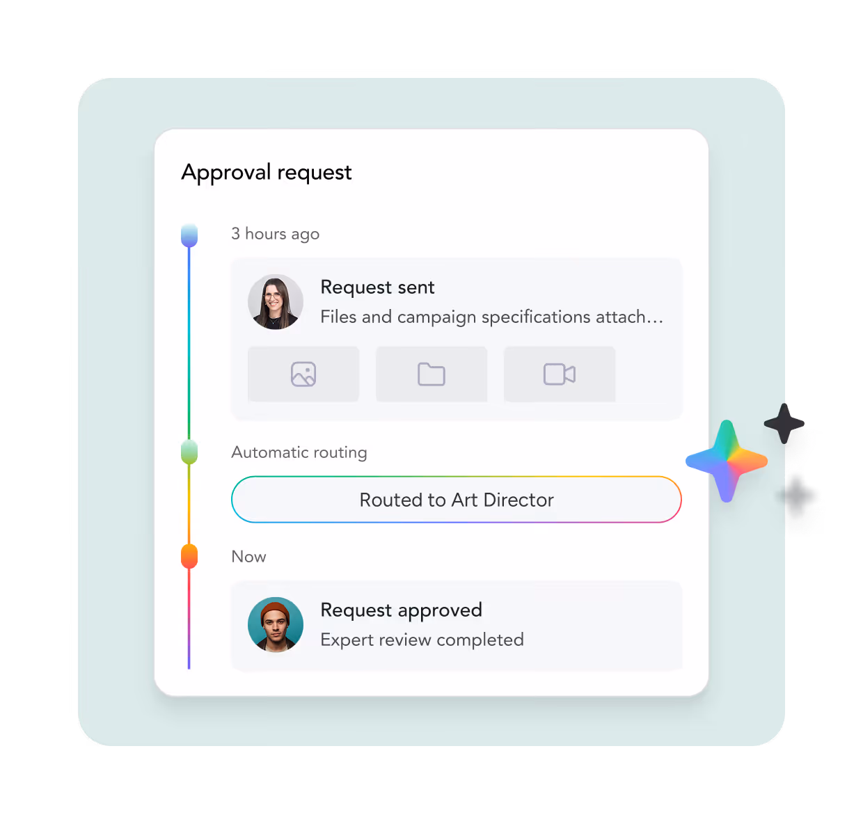 Complex approval request automatically routed to Art Director with complete context, files, and campaign specifications. Expert reviews and resolves in hours with full visibility and audit trail—eliminating email chains, lost attachments, and delayed responses across markets.