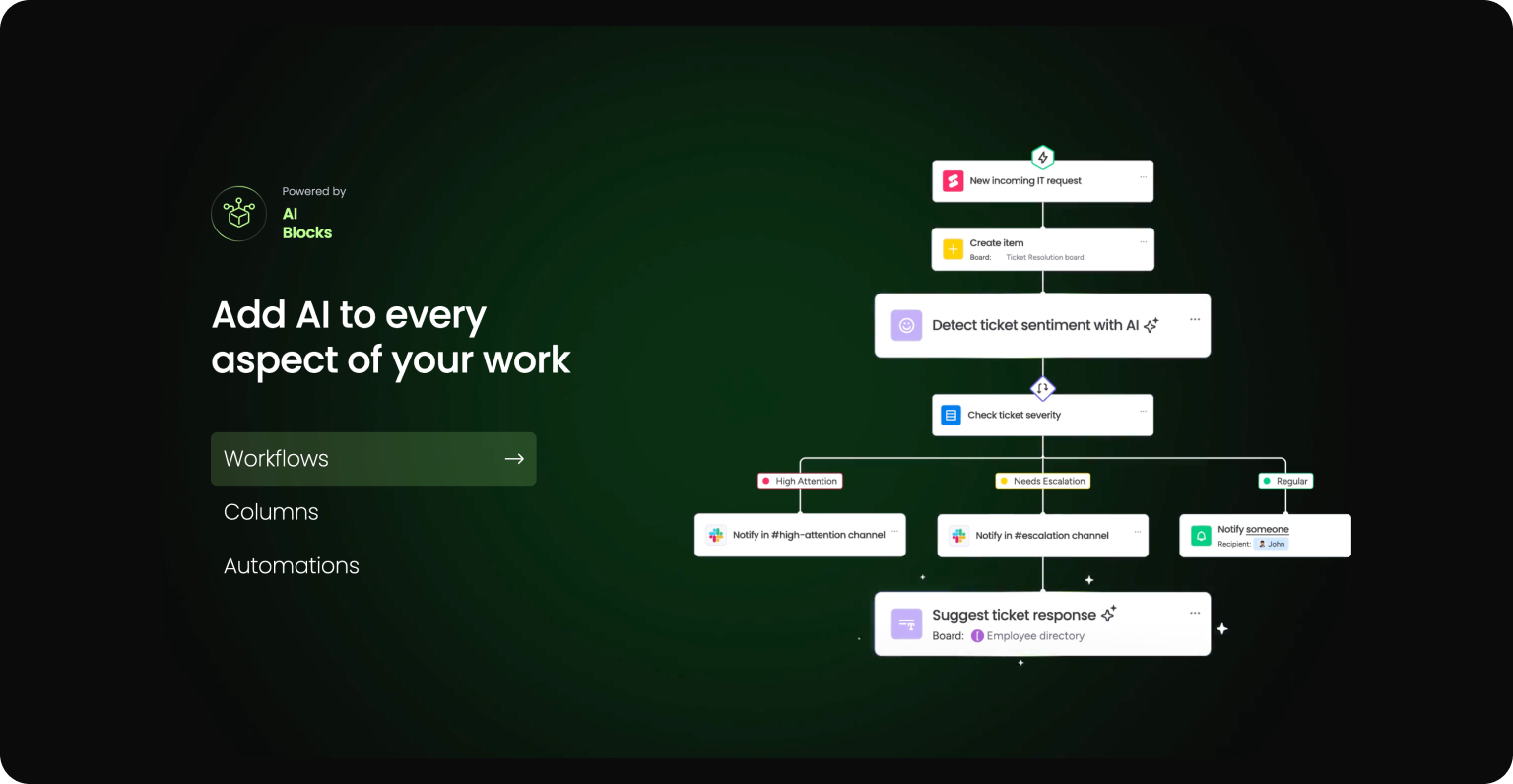 Transformacja AI w monday.com to kompleksowy zestaw narzędzi tworzących inteligentny silnik wykonawczy.