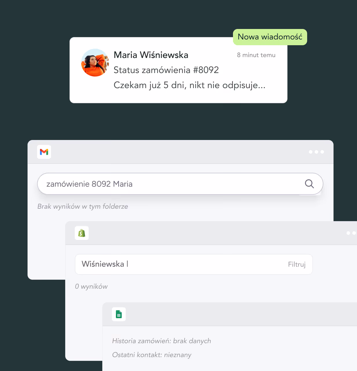 - AI Agent automatycznie rozpoznaje klienta, jego zamówienia i historię